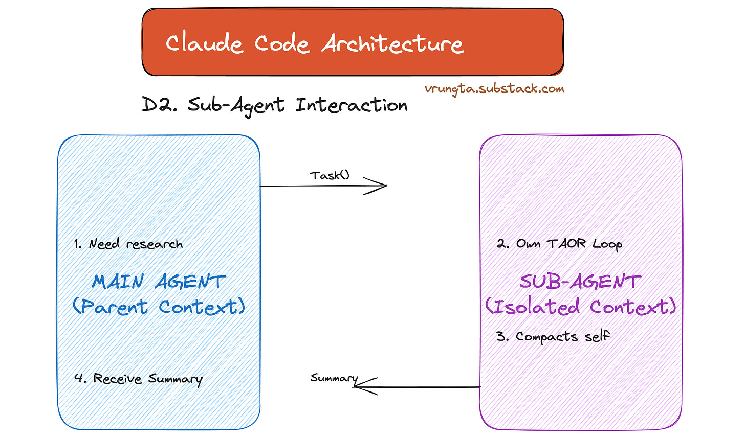 Sub-agents run their own TAOR loop in a separate context window and return a summary. They are the primary mechanism for context isolation — offloading heavy research, testing, or exploration without polluting the main conversation.