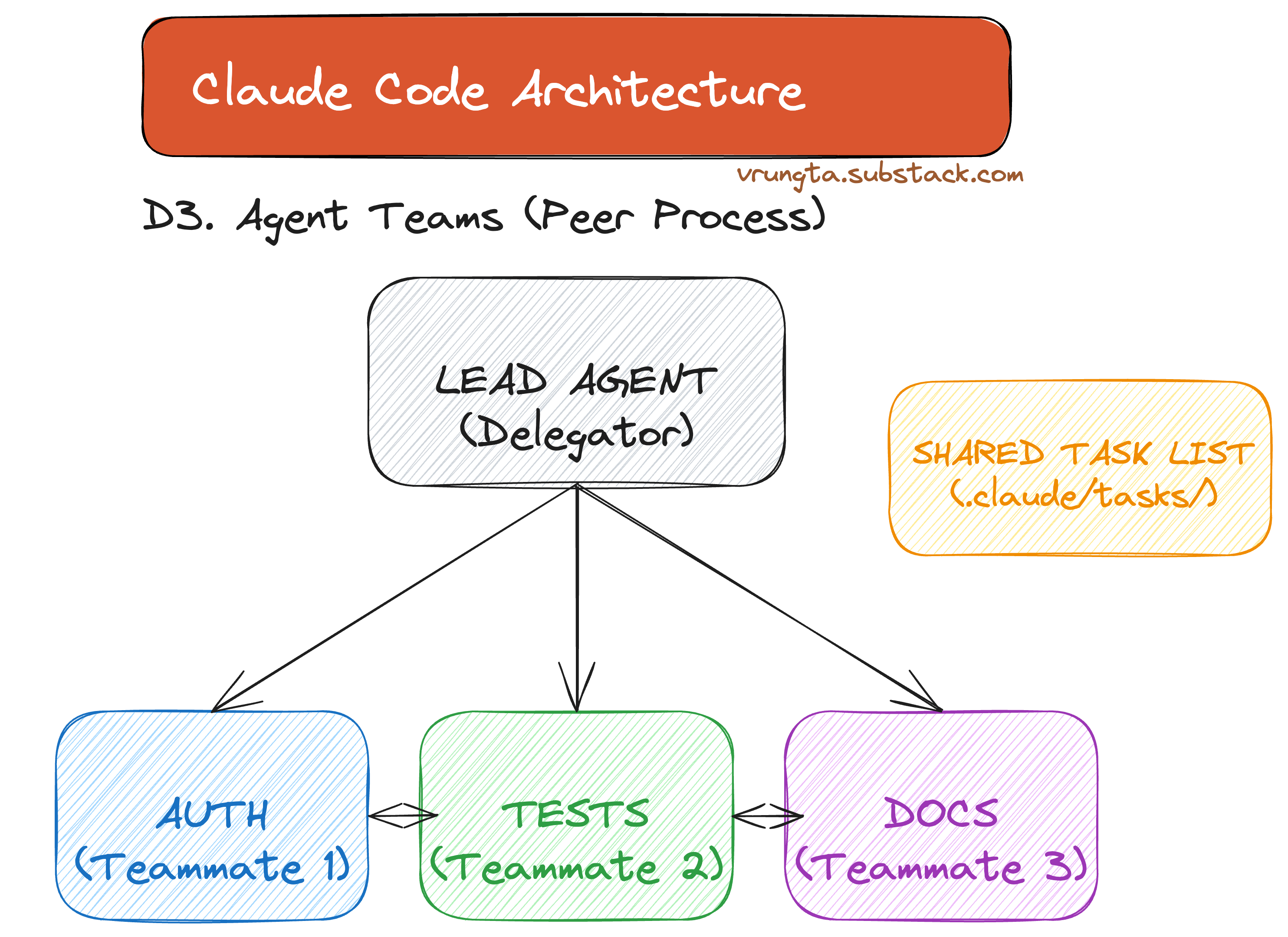 Peer processes that coordinate via a shared task list for parallel implementation across modules.