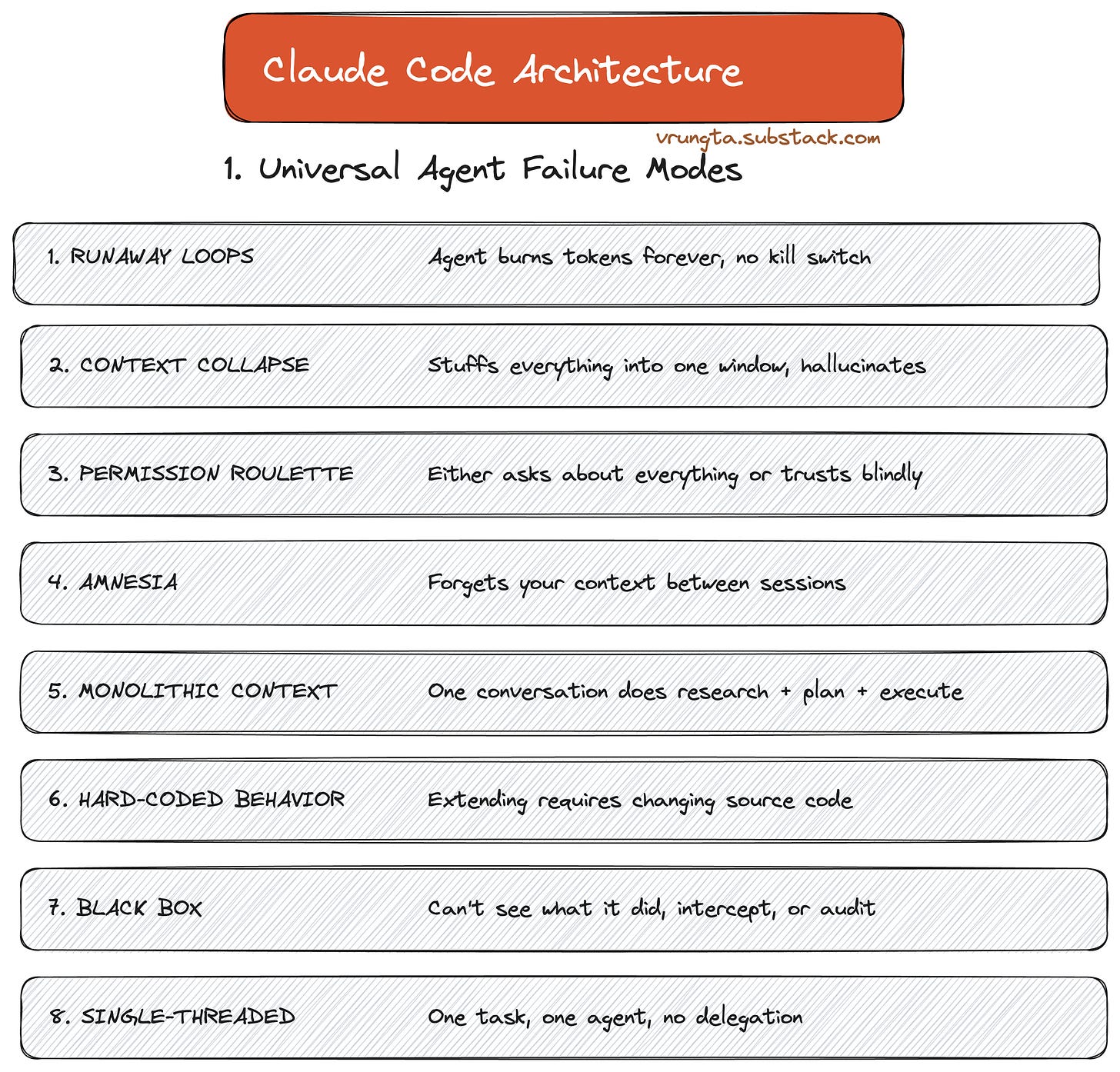Before looking at Claude Code’s architecture, it’s worth understanding why it exists. These failure modes plague every agentic system: customer support bots, research assistants, and internal copilots.
