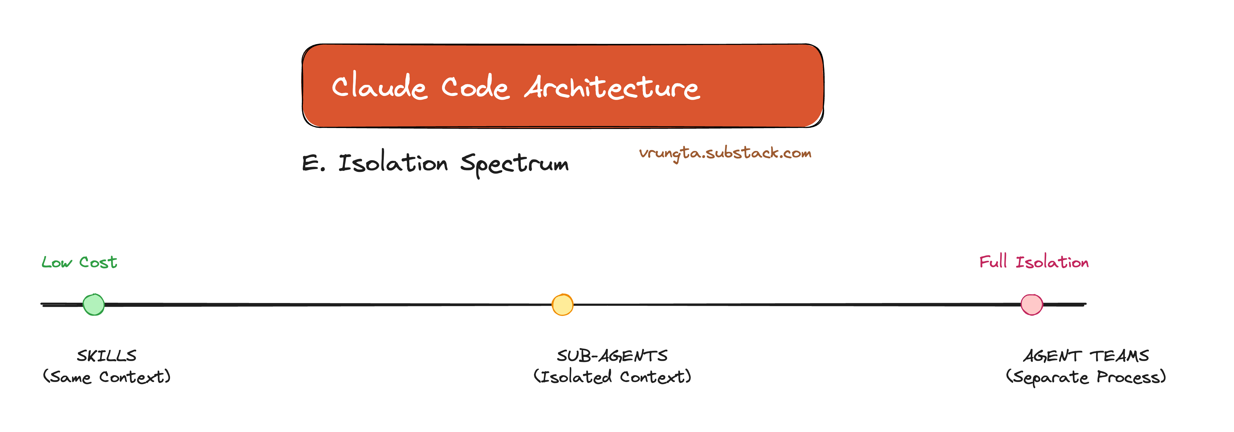 From Skills (same context) to Agent Teams (separate processes), the architecture offers a spectrum of trade-offs between cost and isolation.