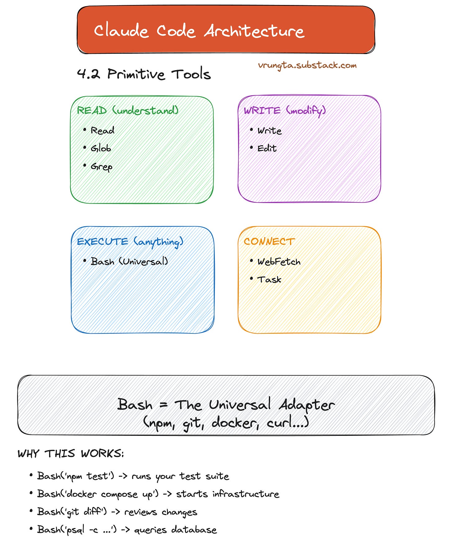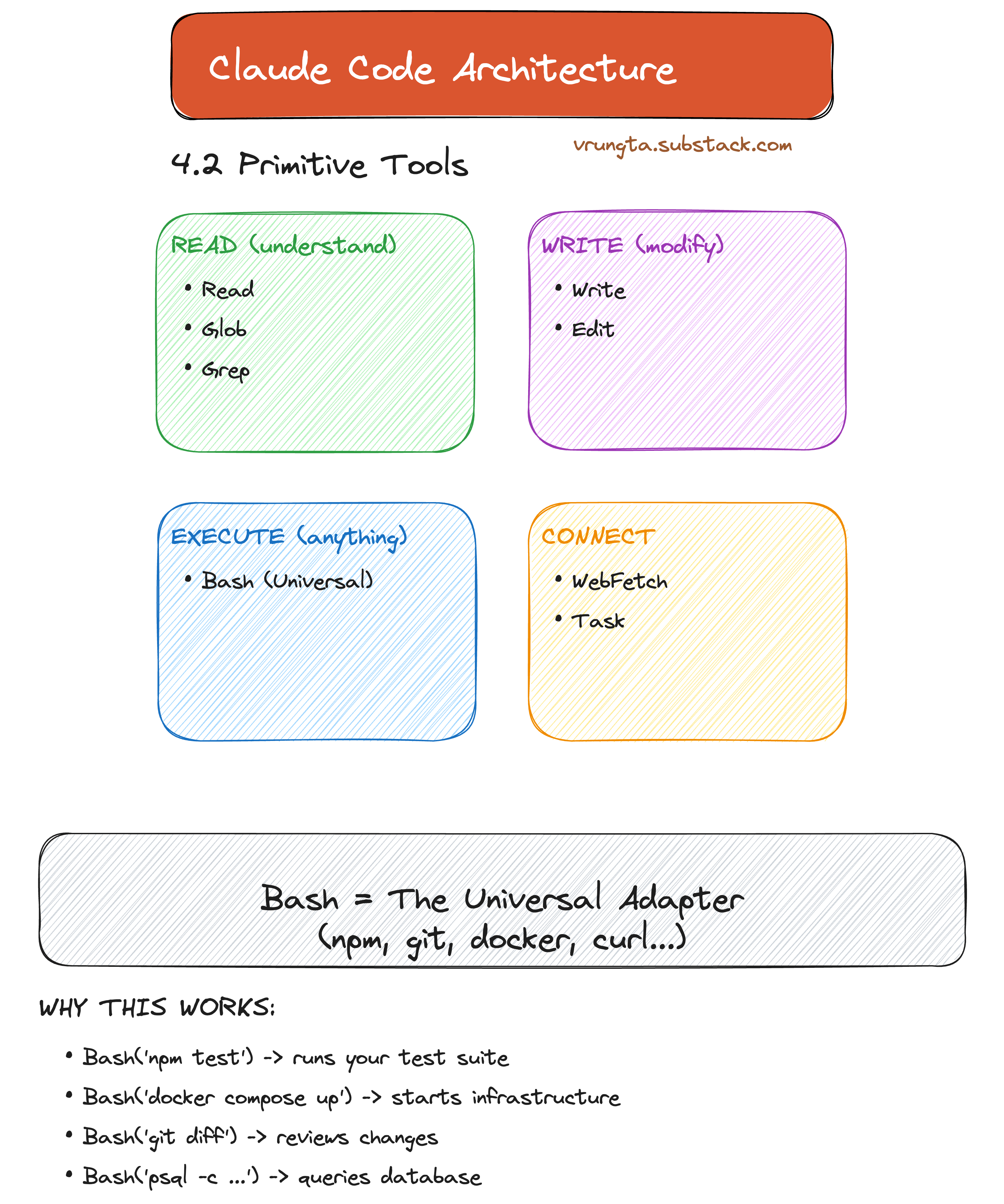 Claude Code uses Capability Primitives: Read, Write, Execute, and Connect. Bash acts as the universal adapter, allowing the model to use any tool a human developer would (git, npm, docker).
