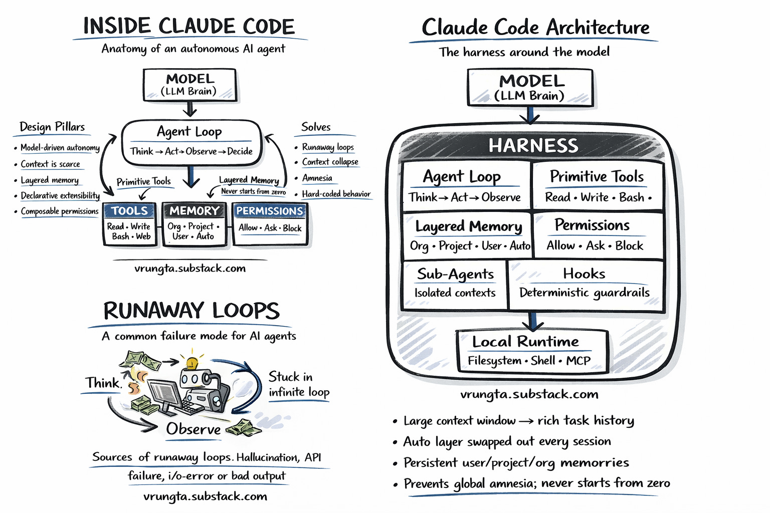 InsightWhy It MattersBuild a dumb loop, not a smart orchestratorThe TAOR loop has ~50 lines of logic. All intelligence is in the model + prompt. This is dramatically easier to maintain and debug.Bash is your most powerful toolDon’t build tool wrappers for npm test or git commit. Give the model a shell and let it compose.Context is your hardest constraintEvery architectural decision — sub-agents, compaction, forked contexts, tool search — exists to manage a single 200K-token budget. Design for it from day one.Think in layers, not monolithsMemory (6 layers), permissions (tool + specifier + scope), extensions (skill → agent → team) — the pattern is always layered composition.Hooks are underratedDeterministic scripts at lifecycle events give you linting, auditing, security gates, and telemetry — without touching the LLM.Delete code when models improveIf you’re adding scaffolding with every release, you’re fighting the model. The harness should get thinner over time.