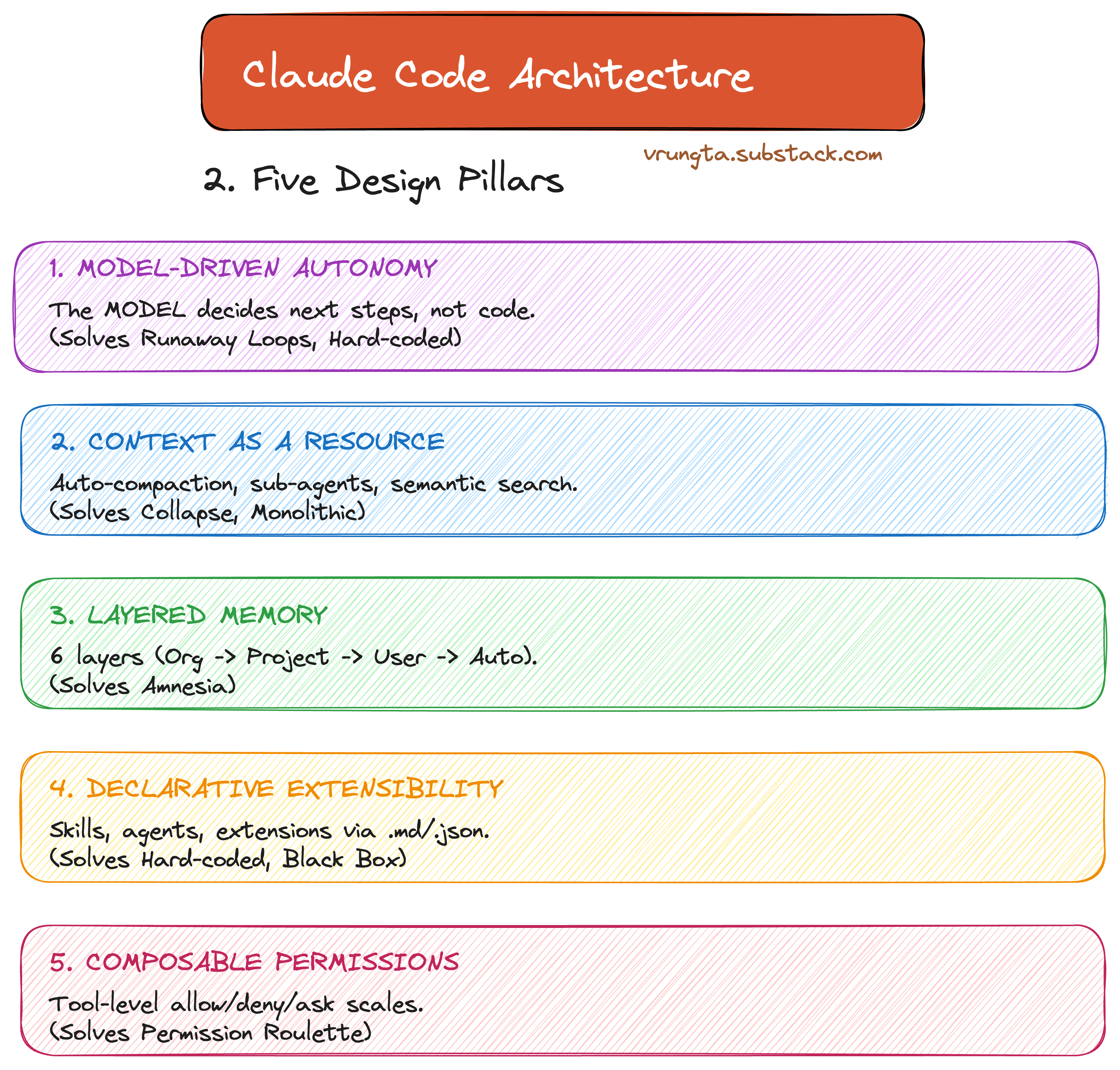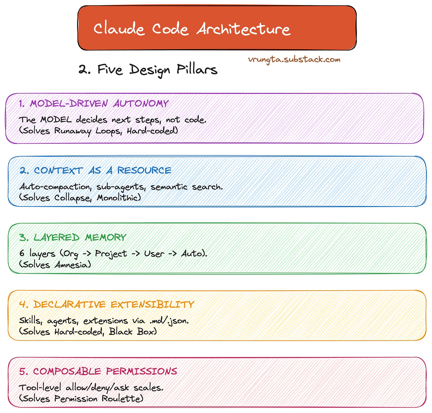 Claude Code answers these failure modes with five core design pillars. Every feature in the product maps back to at least one of these.