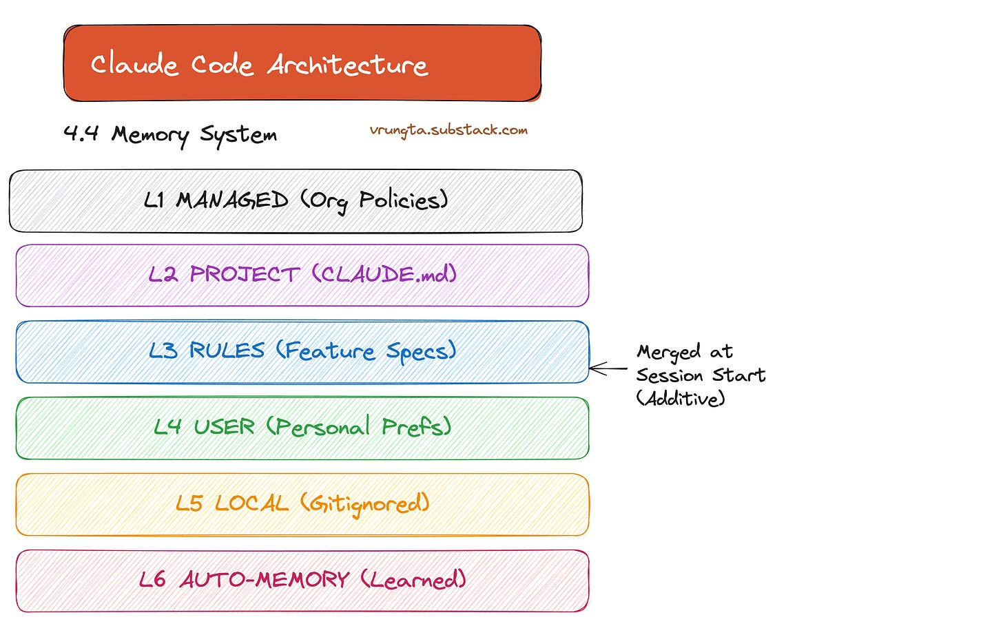 At session start, the agent loads everything from organization policies to personal preferences. The Auto-Memory loop even allows the agent to learn your patterns and write them to MEMORY.md for future sessions.