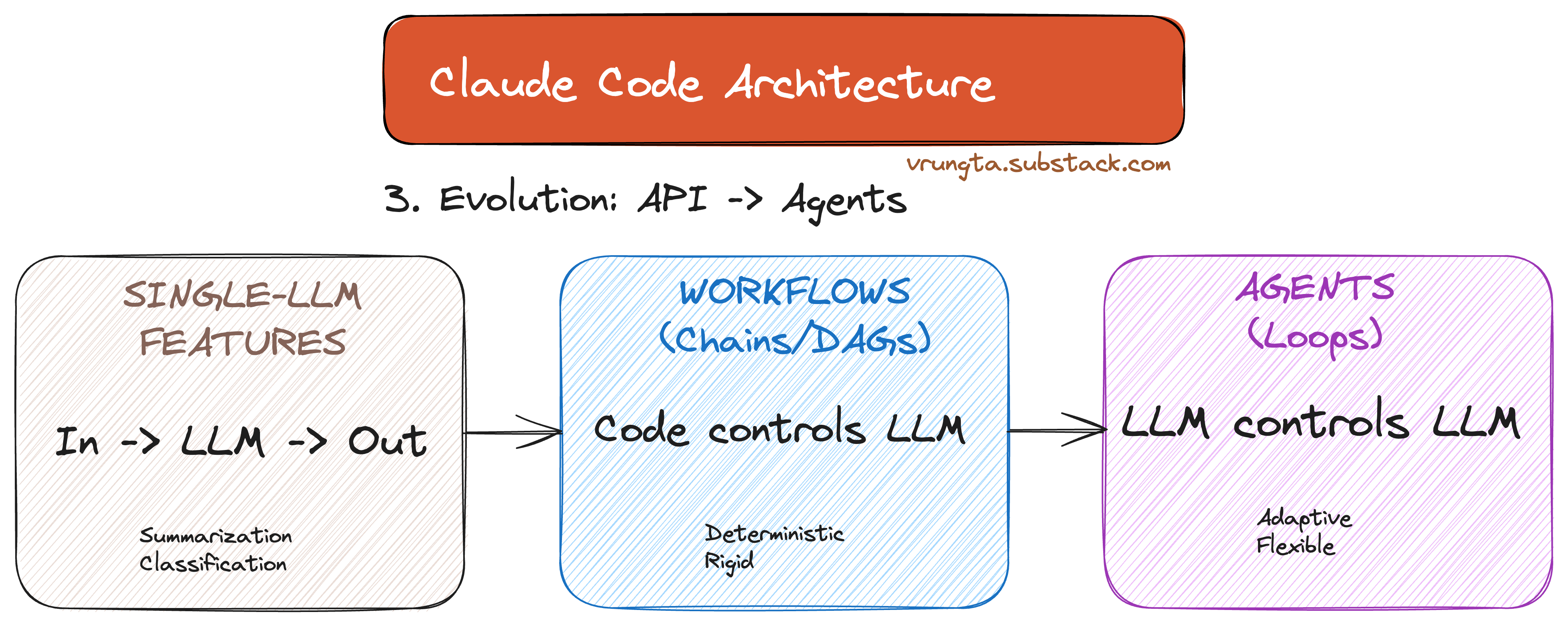 Claude Code represents the third stage of LLM maturity: moving from rigid code-driven workflows to autonomous model-driven loops.