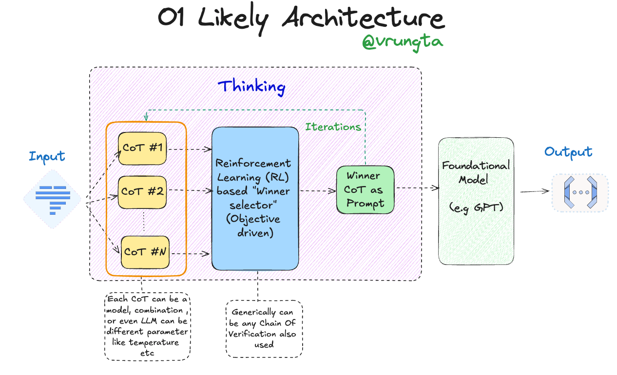 Again, I must emphasize that this article is purely speculative and based on limited public information. The diagram and accompanying explanation represent one possible way that O1 might be architected, but the reality could be quite different. Nonetheless, I hope this exploration sparks further discussion and curiosity about the exciting possibilities in the field of AI and LLMs.